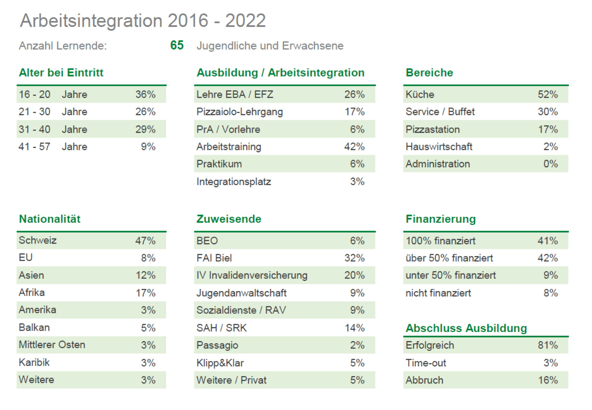 Unser Angebot im Bereich der Arbeitsintegration ist, gegeben durch die Arbeit in einem Restaurantbetrieb, vielseitig, lebendig und interessant. Wir sind, im Vergleich zu anderen, klein und familiär strukturiert, was es uns ermöglicht, gemeinsam individuelle Lösungen für die Herausforderungen des beruflichen und persönlichen Alltags unserer Lernenden zu erarbeiten. Unser Hauptanliegen ist es, Menschen zu befähigen, den (Wieder-)einstieg in die Arbeitswelt gelingend zu gestalten, insbesondere dann, wenn psychische Herausforderungen, längere Arbeitsausfälle oder Migrationserfahrungen diesen erschweren. Dabei arbeiten wir stets auf Augenhöhe und leben ein von gegenseitigem Respekt geprägtes Miteinander.